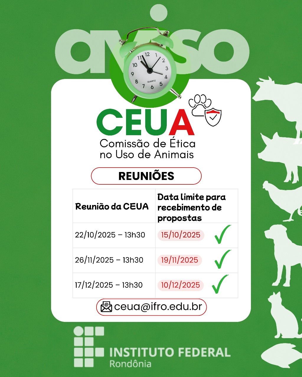 A Comissão de Ética no Uso de Animais – CEUA é um órgão deliberativo e de assessoramento em matéria normativa e consultiva, nas questões sobre a utilização de animais para o ensino e a pesquisa, vinculada ao Ministério da Ciência, Tecnologia e Inovação e tem por finalidade cumprir e fazer cumprir nos limites de suas atribuições, o disposto na legislação aplicável à criação e/ou utilização de animais para o ensino e a pesquisa, caracterizando-se a sua atuação como educativa, consultiva, de assessoria e fiscalização nas questões relativas à essa matéria.