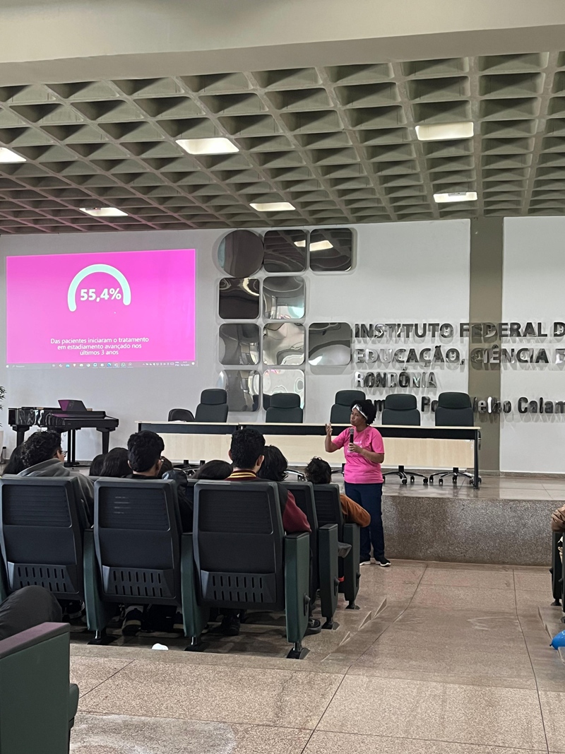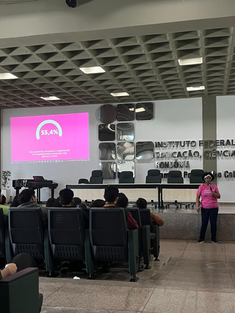 Em alusão à campanha Outubro Rosa, estudantes do Instituto Federal de Educação, Ciência e Tecnologia de Rondônia (IFRO), Campus Porto Velho Calama, participaram de uma palestra voltada à prevenção e conscientização sobre o câncer de mama. A atividade foi na manhã de terça-feira (14), conduzida pela Deputada Federal Silvia Cristina, que compartilhou sua trajetória pessoal de superação e abordou a importância do diagnóstico precoce.