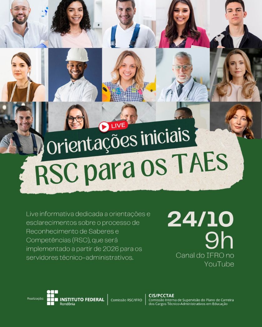 Na sexta-feira, dia 24 de outubro, às 9 horas, o Instituto Federal de Educação, Ciência e Tecnologia de Rondônia (IFRO) realiza uma transmissão ao vivo pelo YouTube com orientações sobre o processo de Reconhecimento de Saberes e Competências (RSC). A proposta será implementada nacionalmente, a partir de 2026, para os servidores Técnico-Administrativos em Educação (TAEs). A ação é promovida pela Comissão de RSC e pela Comissão Interna de Supervisão (CIS).