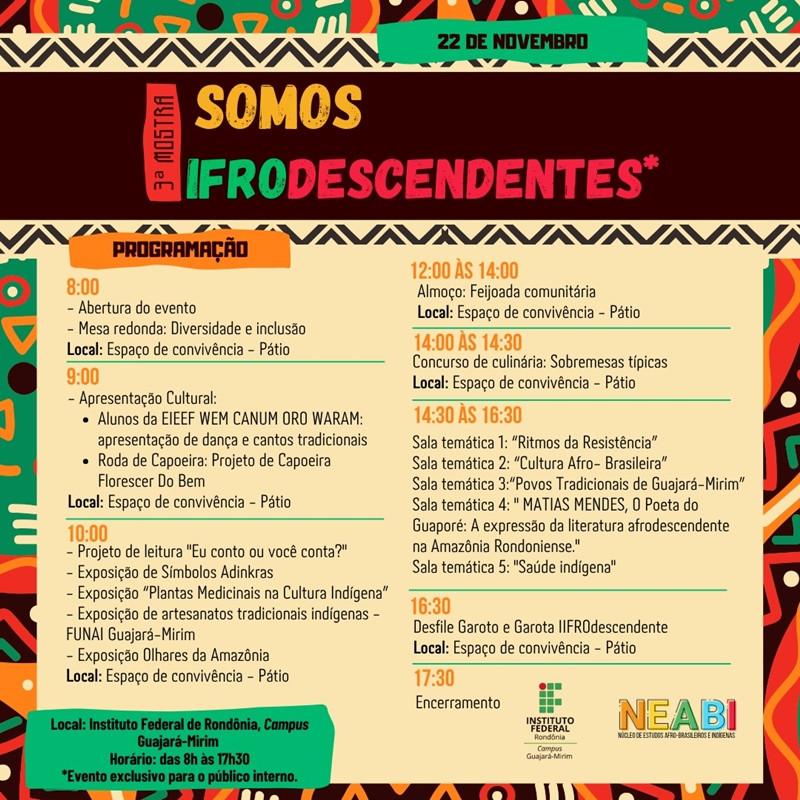 O Instituto Federal de Educação, Ciência e Tecnologia de Rondônia (IFRO), Campus Guajará-Mirim, convida a comunidade interna — estudantes, servidores e colaboradores — para a 3ª Mostra Científica Cultural “Somos IFROdescendentes” O evento ocorrerá no sábado, dia 22 de novembro, das 8 às 17h30, no Espaço de Convivência da unidade.