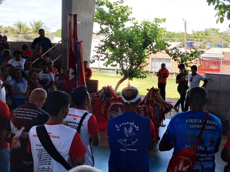 Na quadra poliesportiva do Campus Calama, o Professor Uilian fez um breve relato sobre a origem da Festa do Divino, que há 125 anos é celebrada no Vale do Guaporé por populações remanescentes da colonização portuguesa. Estima-se que cerca de 18 mil africanos escravizados foram levados para a região. Pela primeira vez, os romeiros visitaram a capital, reafirmando o compromisso com a preservação das práticas e dos saberes dos povos tradicionais de Rondônia.