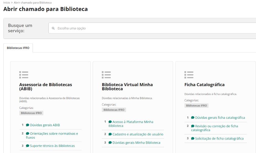 A interface foi organizada em categorias que refletem as demandas mais recorrentes, facilitando a navegação e a localização dos serviços. Entre os grupos contemplados estão áreas como assessoria às bibliotecas, normalização técnica, repositório institucional, ficha catalográfica, biblioteca virtual, Gnuteca e Trabalho de Conclusão de Curso (TCC), agora dispostos de forma clara e intuitiva para aprimorar a experiência do usuário.