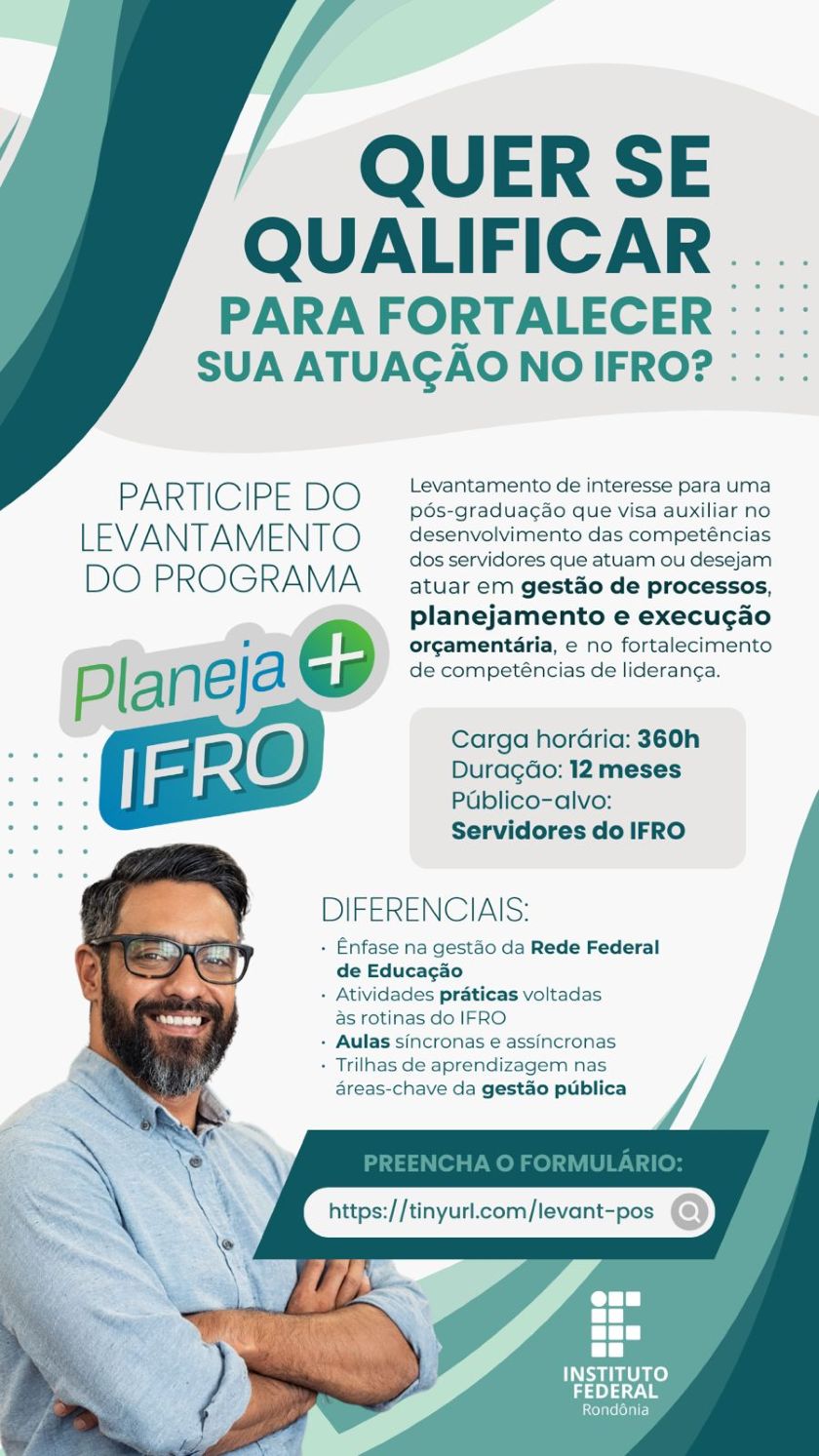 Segundo o Coordenador Geral do Programa Planeja+ IFRO, Fernando Alves da Silva, o levantamento busca identificar o número de servidores interessados na pós-graduação ofertada pelo Programa Planeja+ IFRO. “Esse levantamento nos permite ouvir nossos servidores e fortalecer o planejamento da pós-graduação, ao mesmo tempo em que iniciamos uma divulgação inicial para ampliar o engajamento de toda a comunidade do IFRO”. A iniciativa pretende orientar o planejamento institucional, alinhando a formação às necessidades do quadro técnico e ao desenvolvimento de competências voltadas à gestão pública.