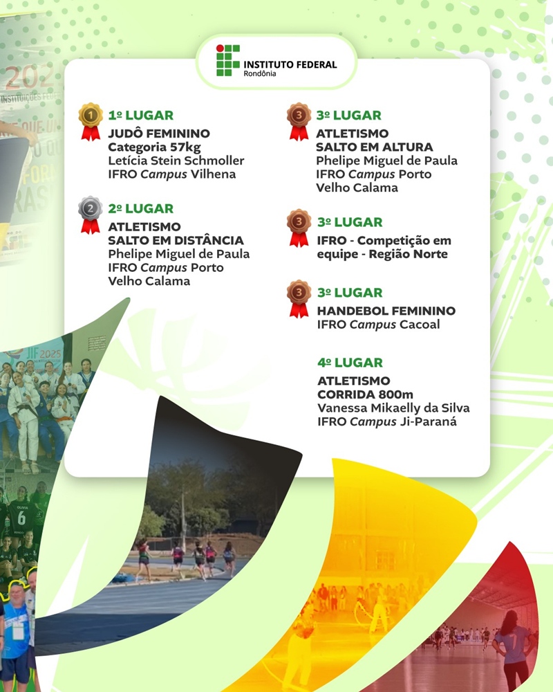 O Instituto Federal de Educação, Ciência e Tecnologia de Rondônia (IFRO) obteve resultados expressivos na Etapa Nacional dos Jogos dos Institutos Federais (JIF 2025), realizada entre 24 e 29 de novembro, em Natal (RN). Todos os atletas representantes do IFRO subiram ao pódio e trouxeram medalhas para a instituição. De pódio, foram conquistados troféus e medalhas: 1 primeiro lugar, 1 segundo lugar, mais 3 terceiros lugares e 1 quarto lugar.