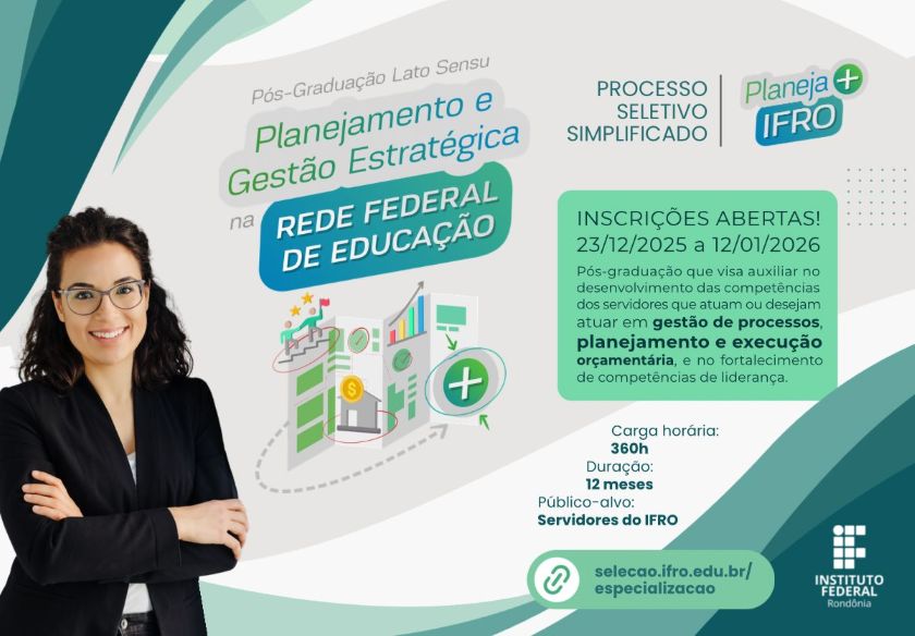 Banner Matéria Seleção de AlunosDesde 23 de dezembro, o Instituto Federal de Educação, Ciência e Tecnologia de Rondônia (IFRO) está com inscrições abertas para o processo seletivo da Pós-Graduação Lato Sensu em Planejamento e Gestão Estratégica na Rede Federal de Educação, ofertada na modalidade a distância (EaD). O curso é destinado exclusivamente a servidores efetivos em atividade no IFRO e integra as ações do Programa Planeja+ IFRO.
