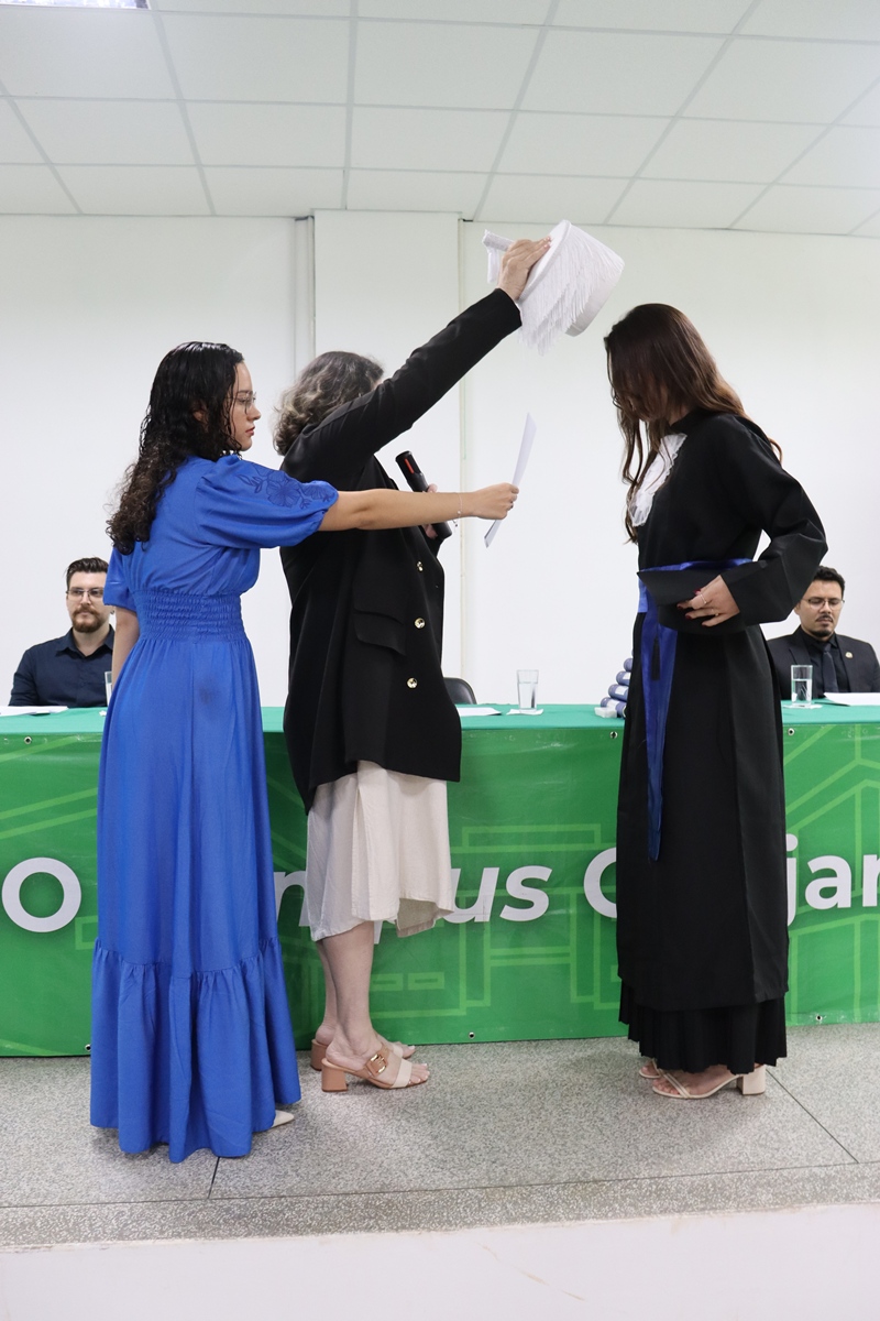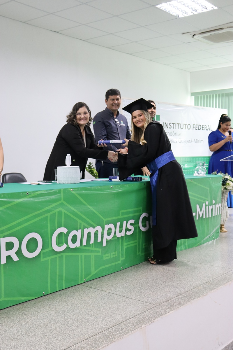 A primeira solenidade foi dedicada à turma de Biotecnologia. A mesa de honra contou com a presença da Diretora-Geral, Elaine Oliveira Costa de Carvalho, do Prefeito Fábio Garcia de Oliveira, da Coordenadora Tassia Alana Alves Ferreira e do Paraninfo Alcides Procópio Justiniano dos Santos Junior. A Oradora da turma, Tamires Cau Valadares, relembrou os desafios exaustivos do curso, destacando que o IFRO foi um ambiente de crescimento que preparou os alunos para muito além dos laboratórios. Em um discurso focado na gratidão, os formandos homenagearam os pais e os professores, como o docente Paulo Prates Junior, ressaltando que a união da turma foi o combustível necessário para superar seminários e noites mal dormidas.