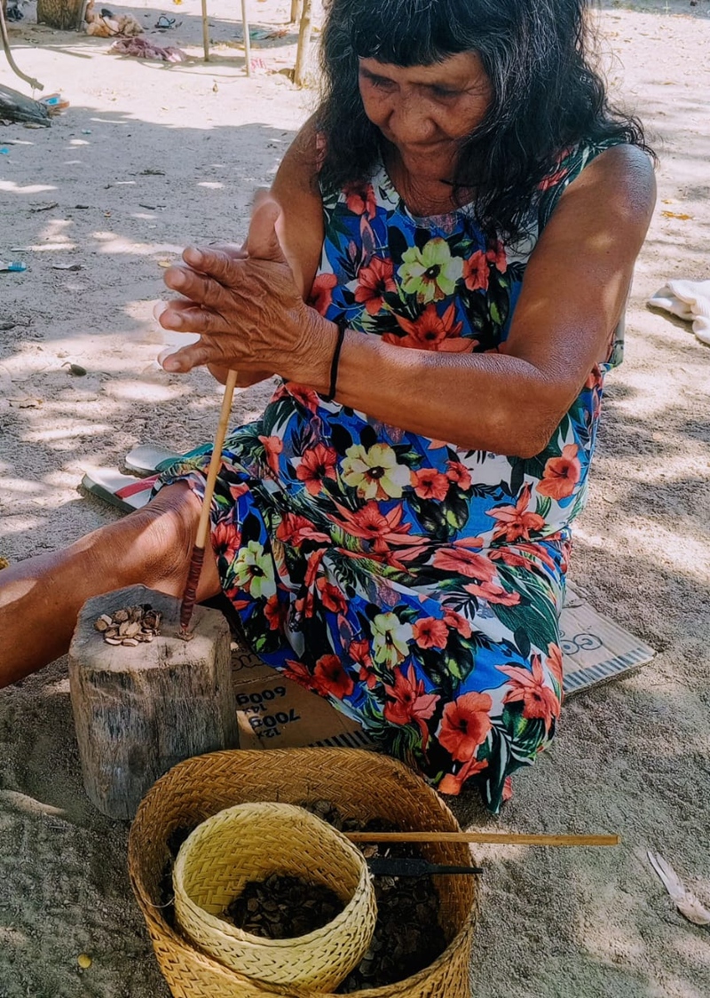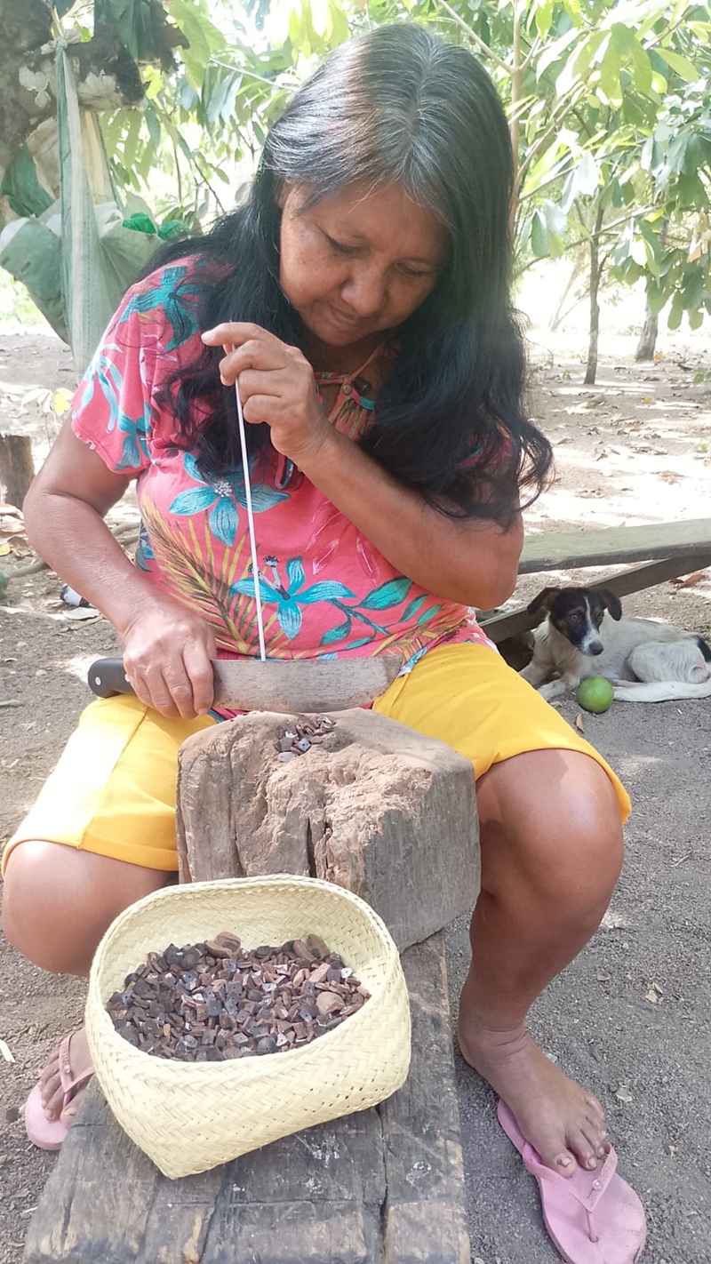 As atividades formativas ocorrem no próprio território indígena e abrangem todas as etapas do processo produtivo, desde a coleta sustentável das sementes, passando pelo tratamento e beneficiamento, até a fabricação, exposição e comercialização das peças. A formação é conduzida pela mestra do saber indígena Olinda Gavião, que domina as técnicas tradicionais e compartilha o conhecimento com as mulheres mais jovens, em diálogo com contribuições técnicas do IFRO.