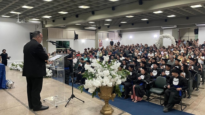 Também abordou a construção da carreira profissional, destacando, com base em Paul Dolan, que a verdadeira felicidade está no equilíbrio entre prazer e propósito, e não apenas no sucesso financeiro. O professor reforçou ainda que a atuação profissional deve ser guiada por valores, compromisso social e responsabilidade, citando o versículo bíblico de Provérbios 16:3 como inspiração. Ao encerrar, o paraninfo desejou que os formandos estejam preparados para atuar como agentes de transformação, unindo conhecimento técnico, ética, humanidade e propósito, contribuindo de forma positiva para a sociedade.