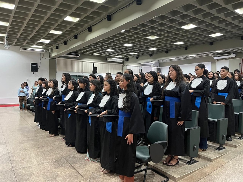 A estudante Mahina Uiara Gorayeb Lucas conduziu o juramento, no qual os formandos se comprometeram a exercer a profissão com responsabilidade, ética e humildade, além de estimular o conhecimento científico e buscar novas tecnologias em benefício de uma sociedade mais justa e consciente. Em seguida, o Reitor conferiu simbolicamente a certificação à estudante Geovana Alves da Silva, que representou os demais concluintes, destacando que, a partir daquele momento, os formandos passaram a usufruir dos direitos e prerrogativas assegurados pelas leis da República.