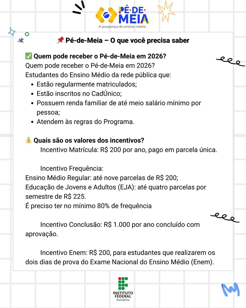 Para 2026, são elegíveis estudantes com renda familiar de até meio salário-mínimo por pessoa, conforme critérios definidos na Lei nº 14.818 de 2024. “O Programa Pé-de-Meia vai além de um auxílio financeiro, configurando-se como um investimento direto no futuro e uma importante ferramenta no combate à evasão escolar. Ao reconhecer os desafios socioeconômicos que impactam a trajetória educacional, a iniciativa oferece suporte concreto, permitindo que os discentes se dediquem aos estudos com maior tranquilidade e tenham suas jornadas acadêmicas fortalecidas”, diz o Pró-Reitor de Ensino do IFRO, Jean Campos Peixoto