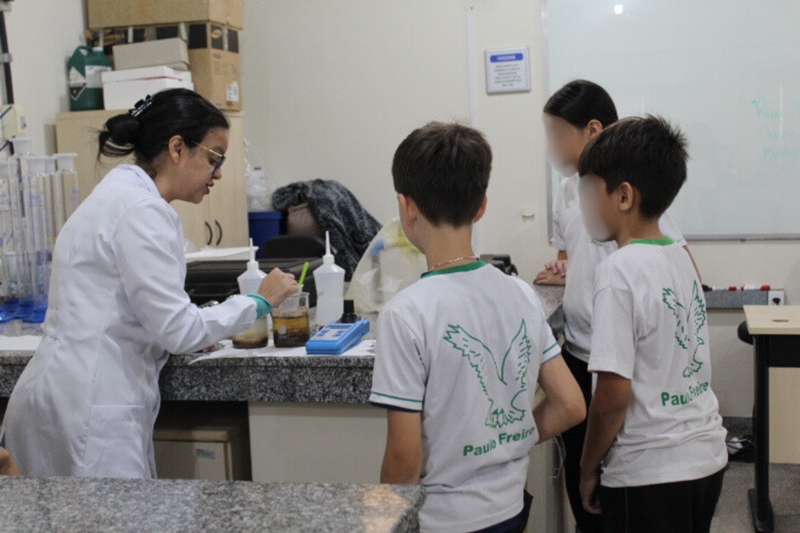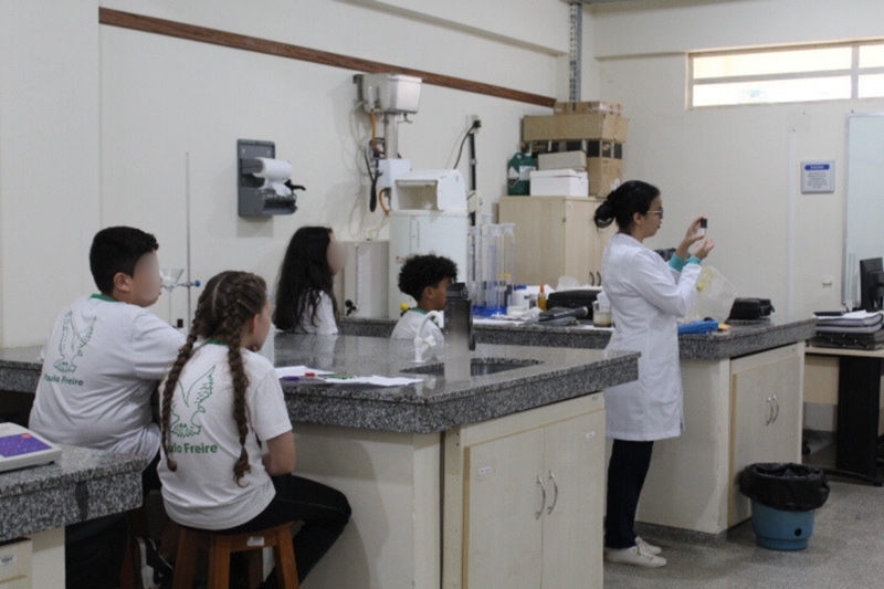 Outra iniciativa realizada no campus foi a oficina “Tratamento de Água: da natureza até a torneira”, com o apoio da Técnica em Laboratório de Biologia, Misley Alzira da Silva Estêvão, no Laboratório de Química e Biologia do IFRO Campus Vilhena. A atividade ocorreu nos dias 11 e 12 de setembro de 2025 e recebeu estudantes do 6º ano da Escola Estadual de Ensino Fundamental Paulo Freire, acompanhados da professora de Ciências Maressa Floriano Camargo.