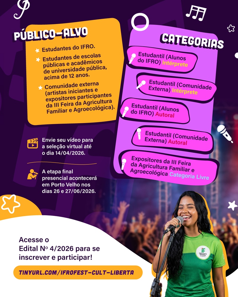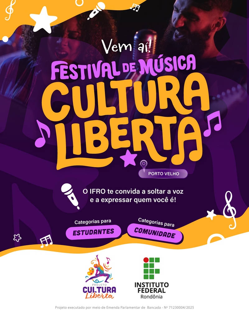 O Instituto Federal de Educação, Ciência e Tecnologia de Rondônia (IFRO) torna pública a abertura das inscrições para o Festival de Música “Cultura Liberta”, conforme estabelecido no Edital nº 4/2026. A iniciativa tem como objetivo promover a valorização da cultura musical, incentivar a produção artística e fortalecer a integração entre a comunidade interna e externa.