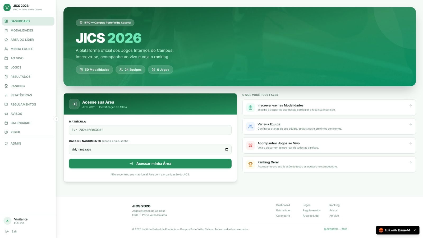 O desafio foi assumido pelo estudante do terceiro ano do curso técnico integrado em InformáticaTarso Rondon, que levou o projeto até sua entrega eimplementação nos JICS 2026. Para isso, o aluno precisou reestruturar todo o planejamento, reconstruir o sistema praticamente do zero e dialogar diretamente com os professores de Educação Física do campus para compreender as reais necessidades da competição.