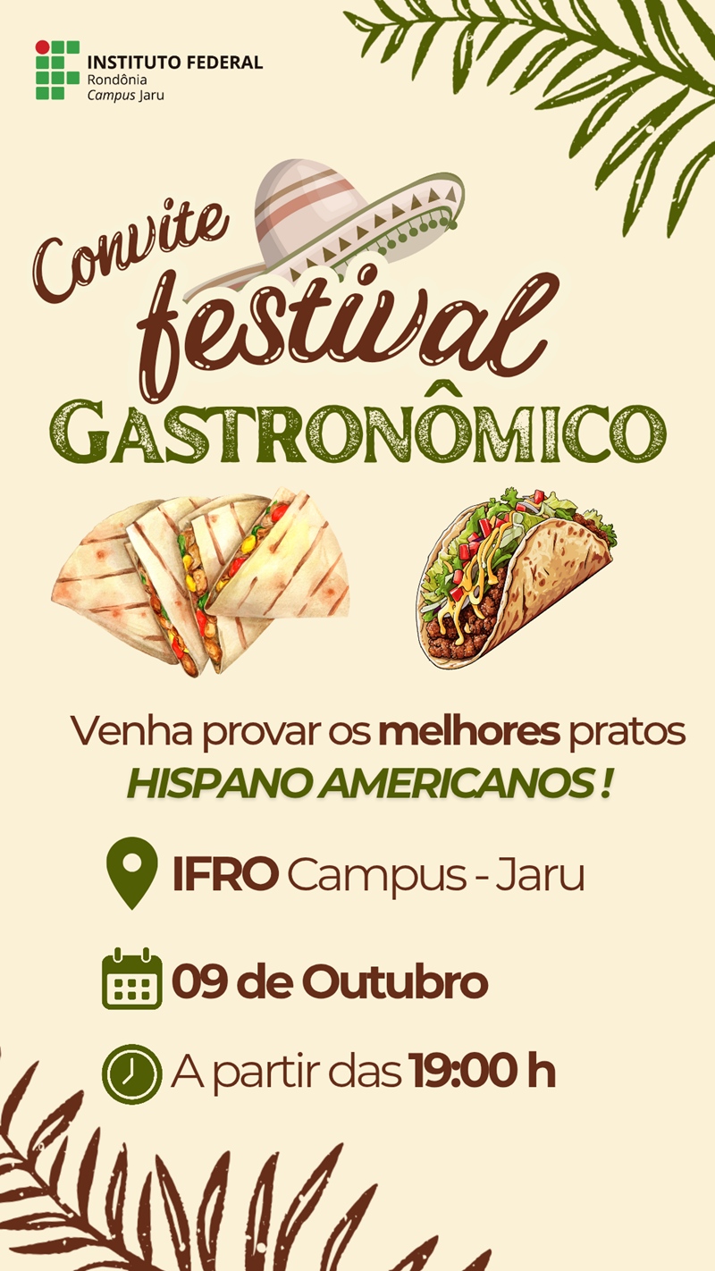 O Instituto Federal de Educação, Ciência e Tecnologia de Rondônia (IFRO), Campus Jaru, realizou na noite de 9 de outubro o 2º Festival Gastronômico Hispano-Americano, reunindo estudantes, educadores, pais e responsáveis em uma noite de integração cultural e educativa. O evento, realizado no pátio do campus, faz parte de um projeto interdisciplinar envolvendo alunos dos segundos anos dos Cursos Técnicos Integrados em Alimentos, Comércio e Zootecnia.
